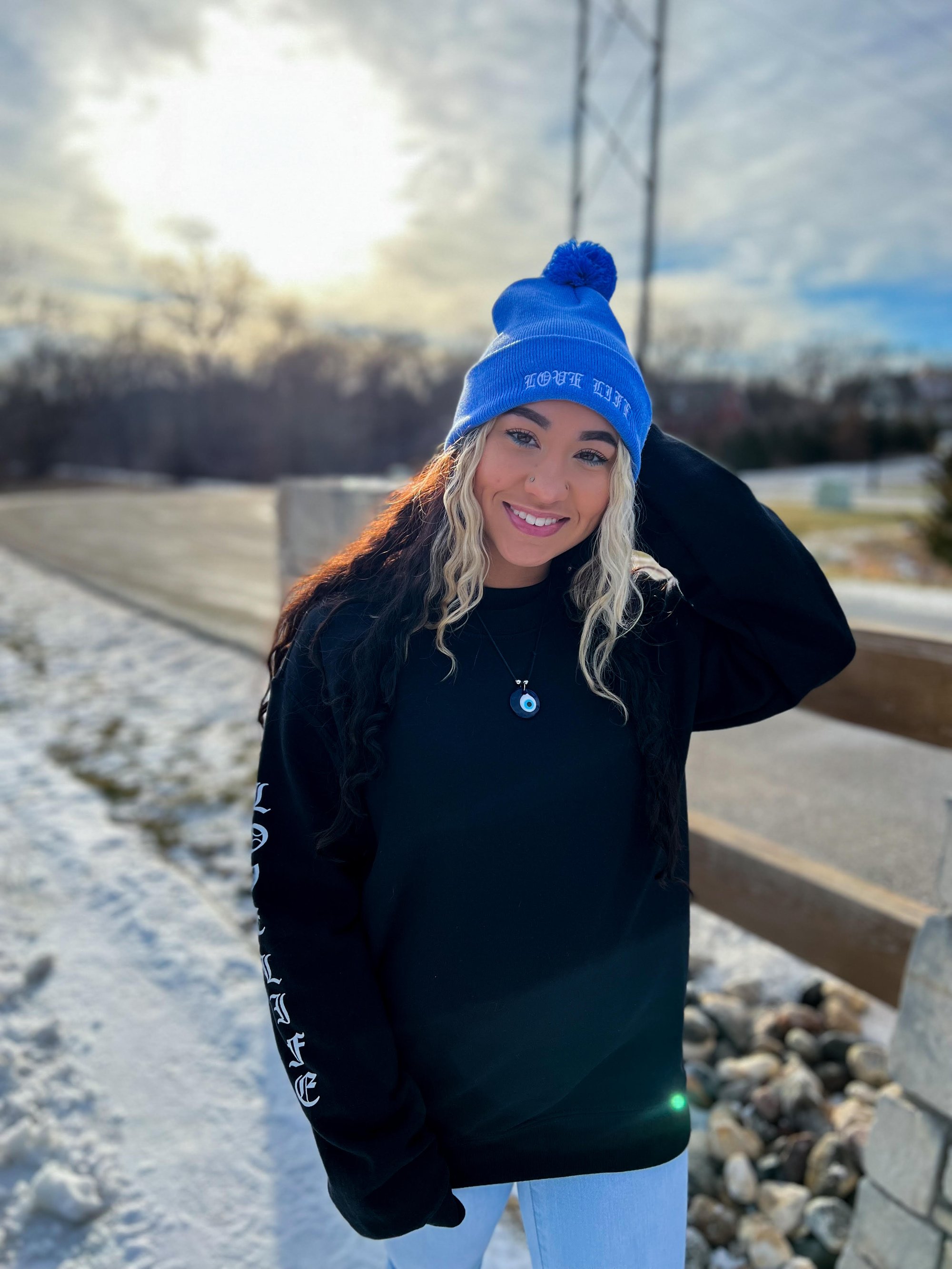 BLACK LONG SLEEVE TEE W/ 'LOVE LIFE' TEXT ON LEFT SLEEVE & 'LOVE LIFE' ROSE DESIGN ON BACK