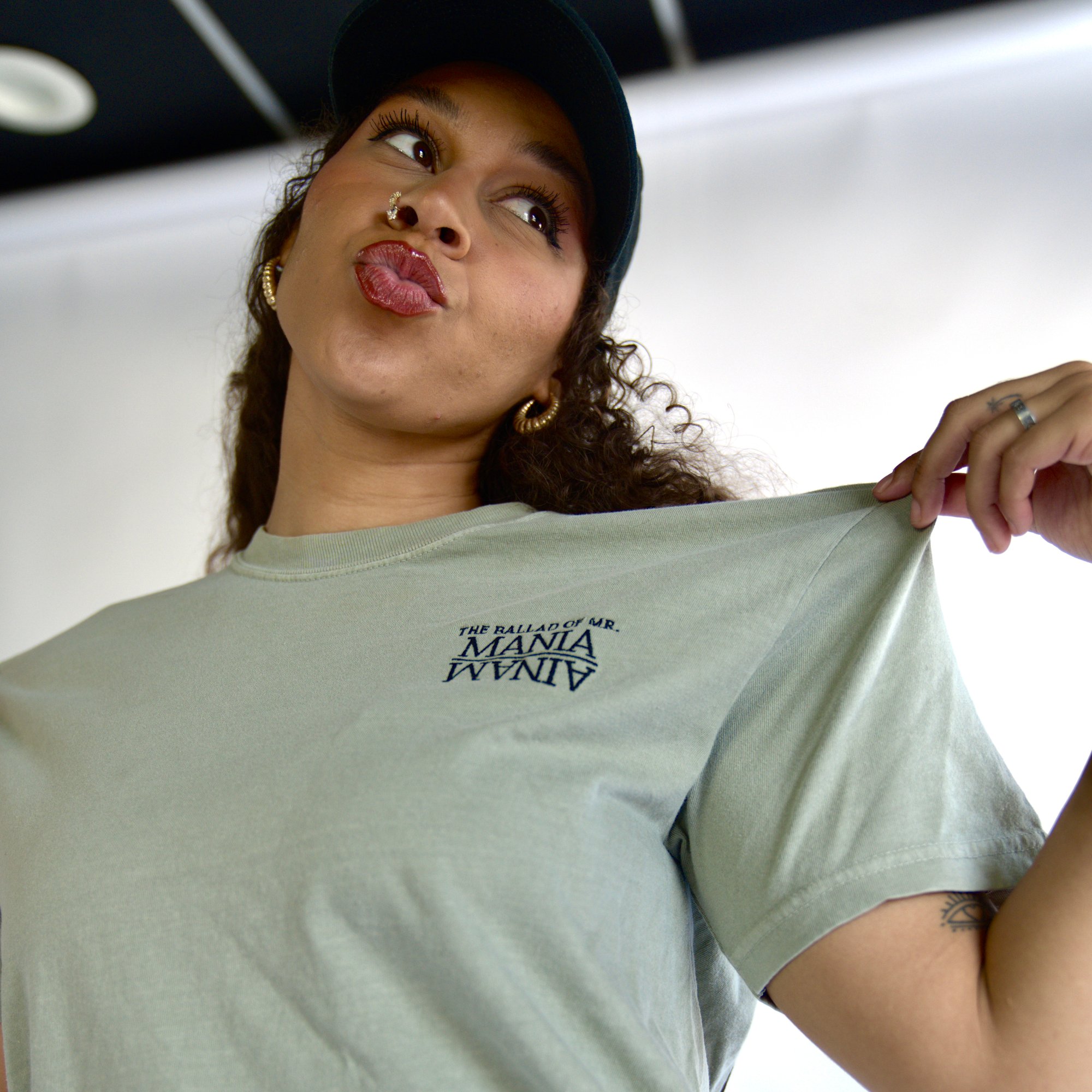 TEE SHIRT WITH MR. MANIA LOGO EMBROIDERED ON CHEST, WAVEFORM LOGO ON OPPOSITE SLEEVE CUFF, AND THE BALLAD OF MR. MANIA MANIC EDITION COVERART SCREENPRINTED ON BACK