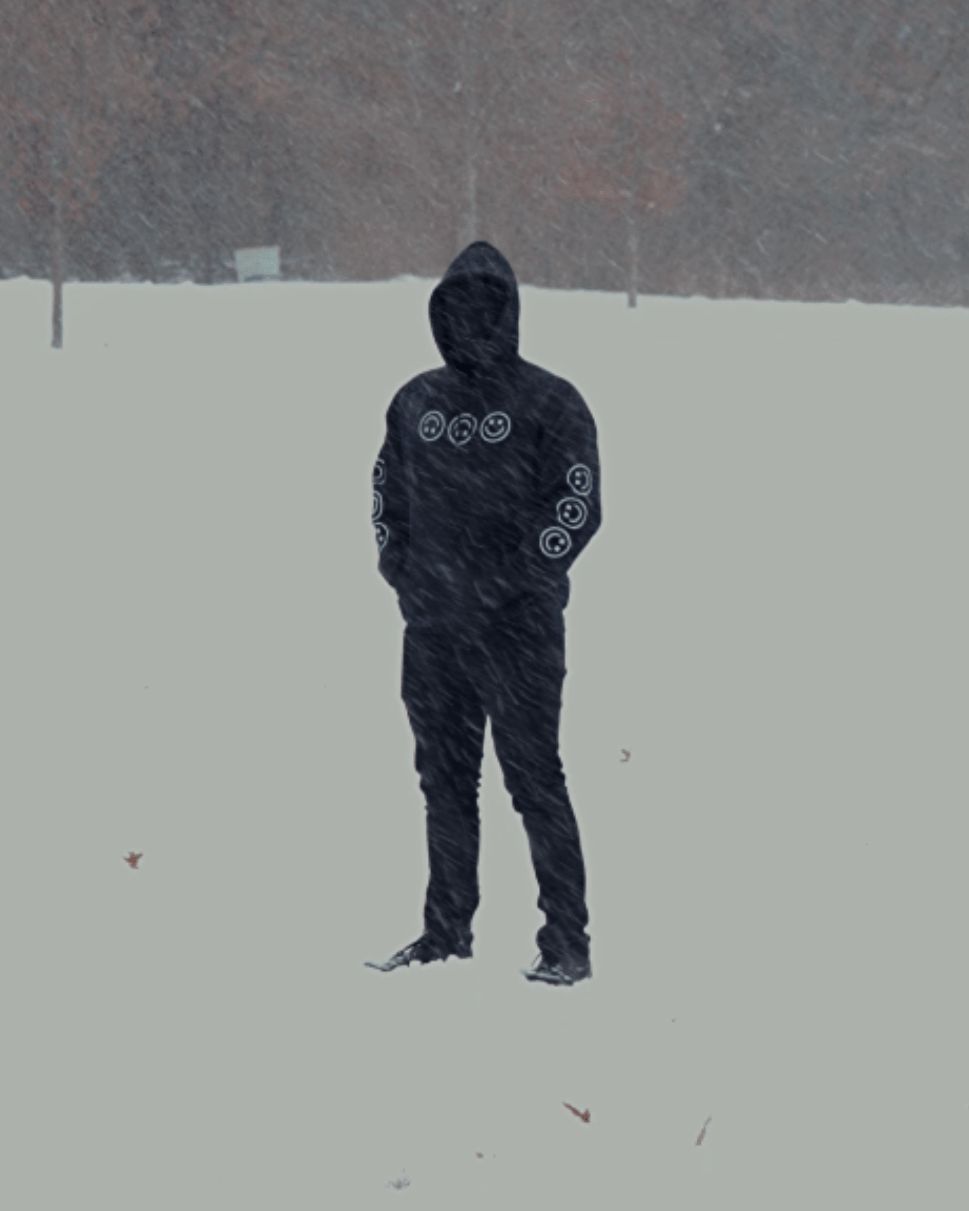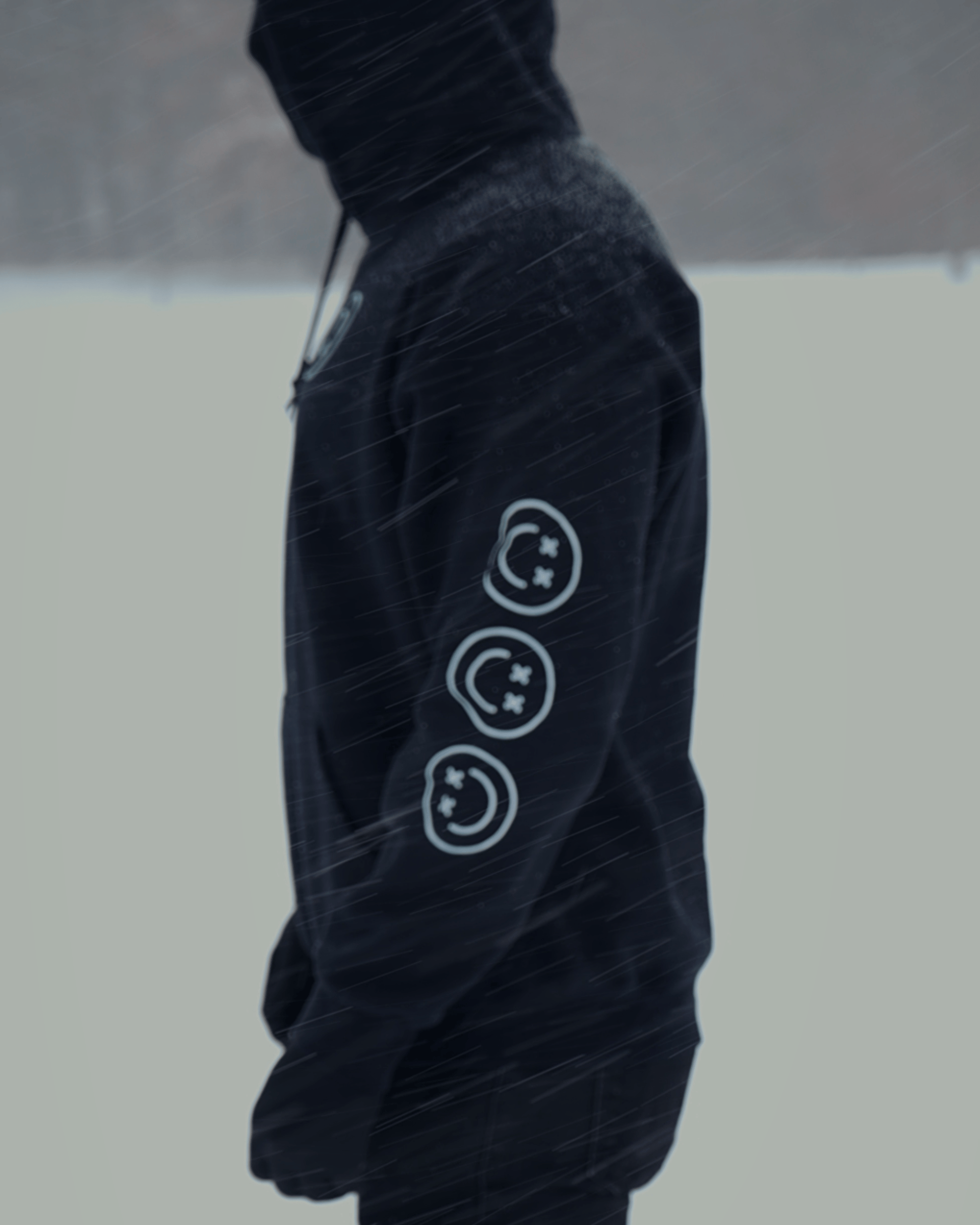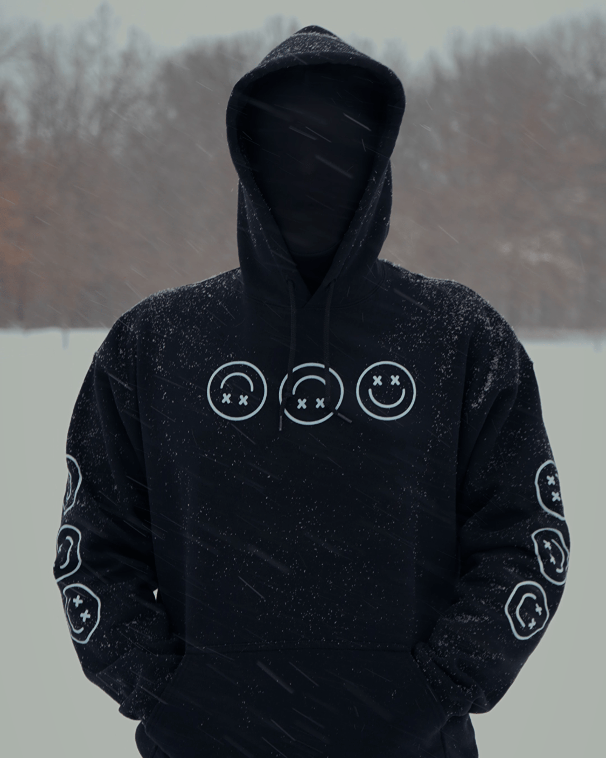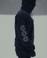 BLACK HOODIE WITH TRIPLE SMILEY FACE DESIGN ON CHEST AND BOTH SLEEVES